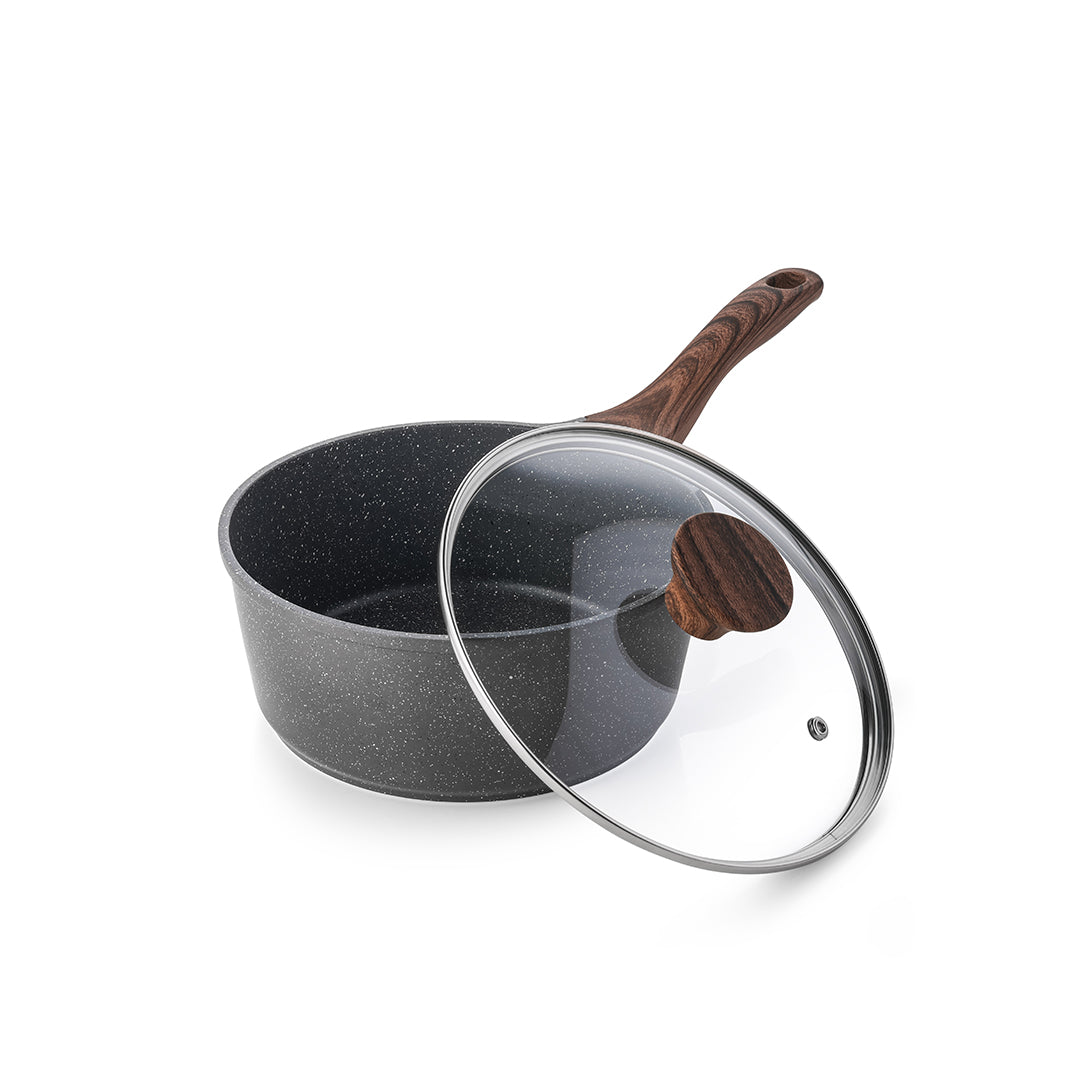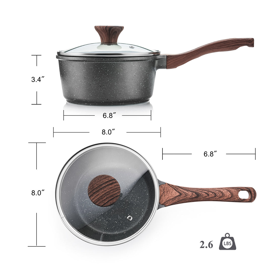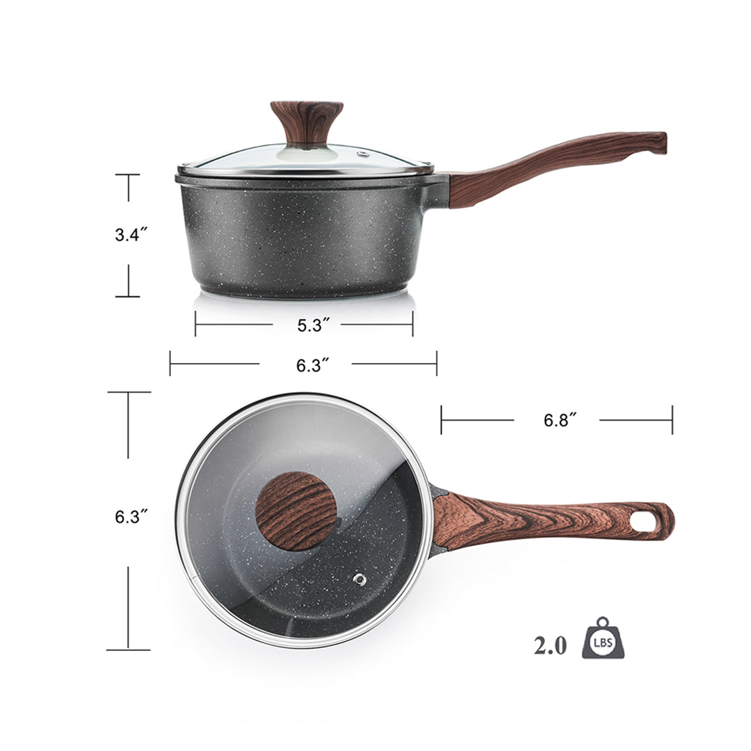 - Glass Lid & Stay-cool Handle - Long-lasting tempered glass lid makes this small induction saucepan with lid convenient to see the cooking status and limits splashes on your stove. Woodgrain bakelite handle is comfortable to grip and stays cool while cooking. Oven safe to 302°F.